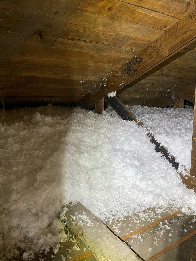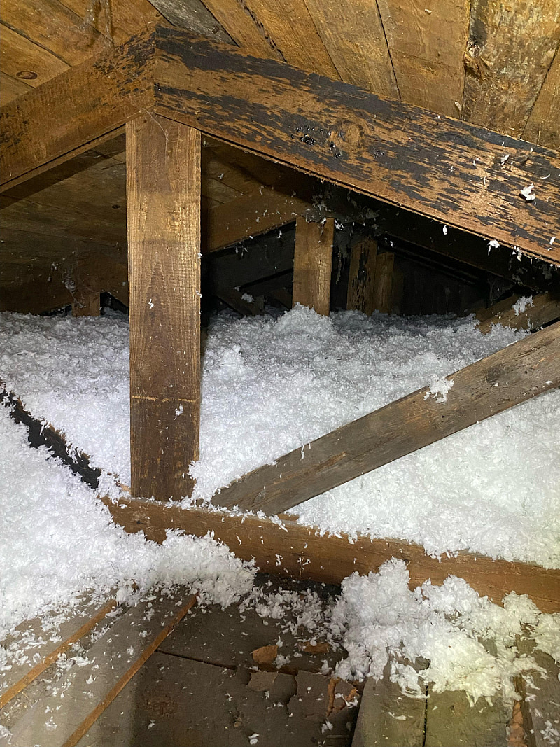 Chata, která prochází kompletní rekonstrukcí potřebovala zaizolovat stropy, aby všechno teplo zbytečně neuteklo. Přístup byl velice těsný, ale podařilo se. Materiál: minerální izolace URSA Pure Floc o tloušťce 35 cm.