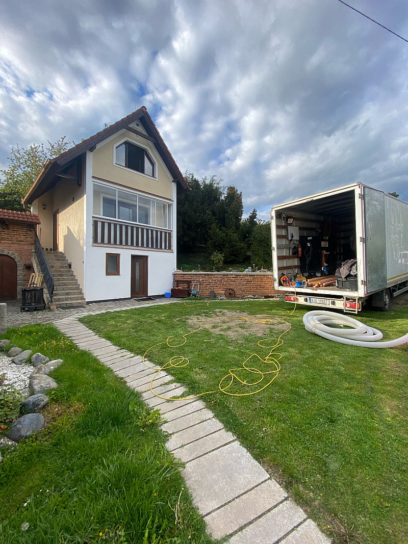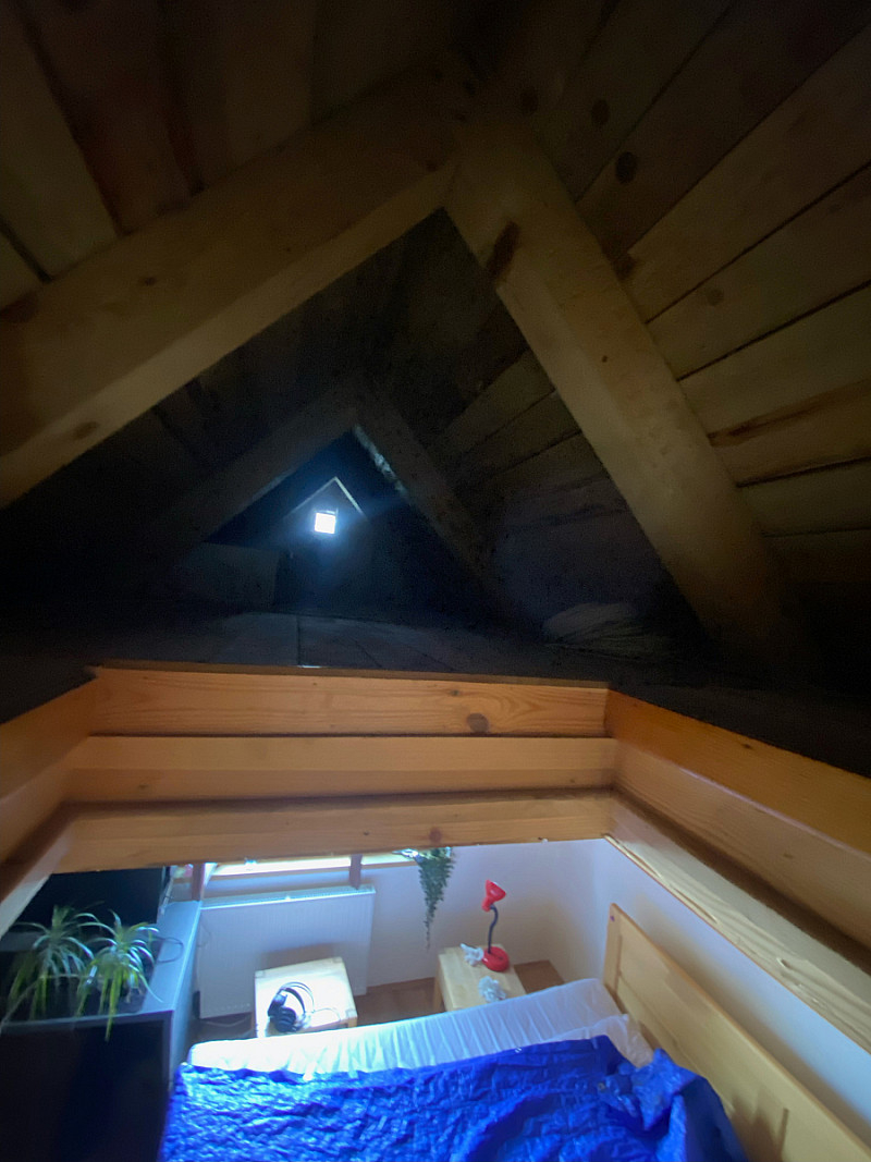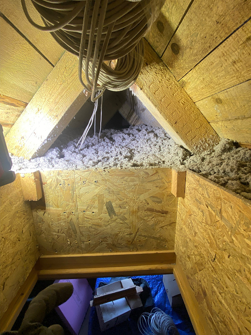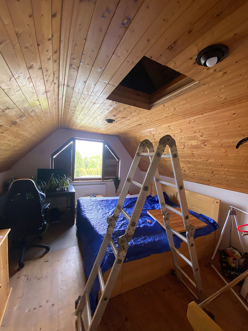 Tento domeček měl ve stropní části pouze 8 cm vaty, poklop byl “zateplen” pouhými 2 cm polystyrenu, proto byla místnost velice chladná a unikalo nemalé množství tepla. Vyklidili jsme půdičku, vytvořili bednění kolem výlezu a zpřístupnili kabely od internetu a antény. Zbytek jsme vyplnili foukanou izolací.
