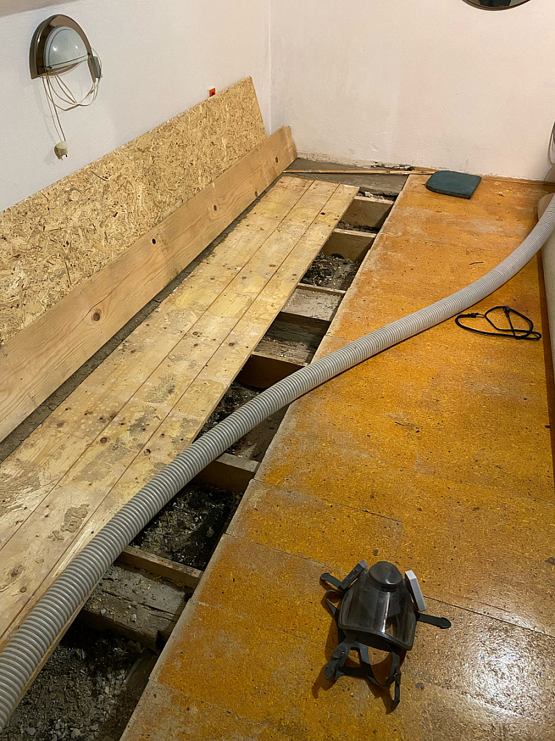 Majitel tohoto domu potřeboval vyplnit dutinu podlahy, jelikož zde vznikal průvan. Nepříjemné to bylo především v zimním období, kdy byla podlaha velice studená. Nyní je dutina napěchována izolací a je po problému.