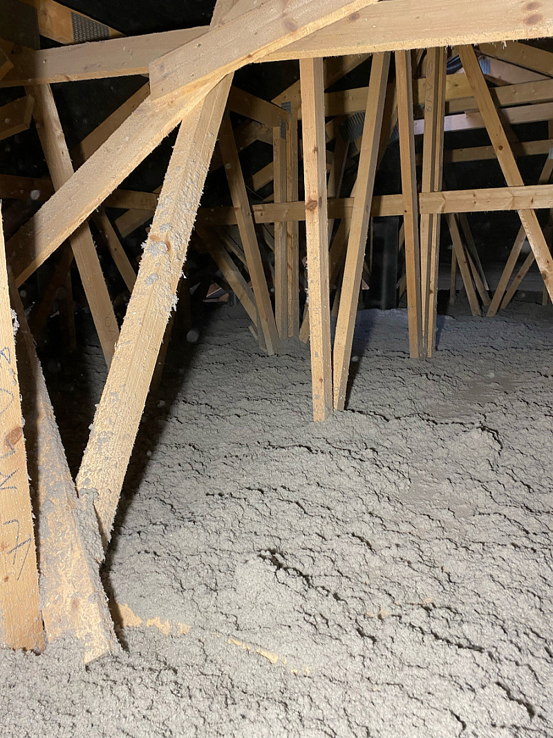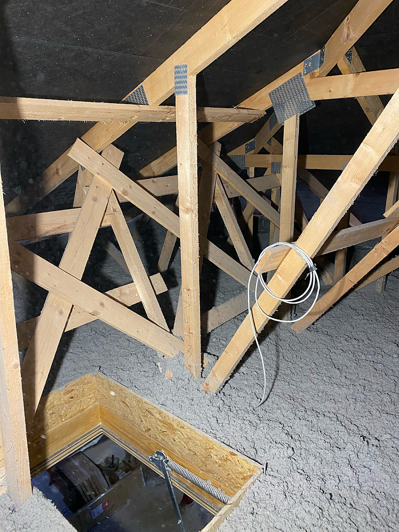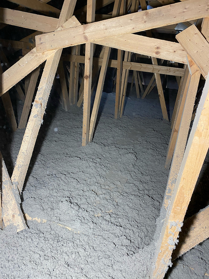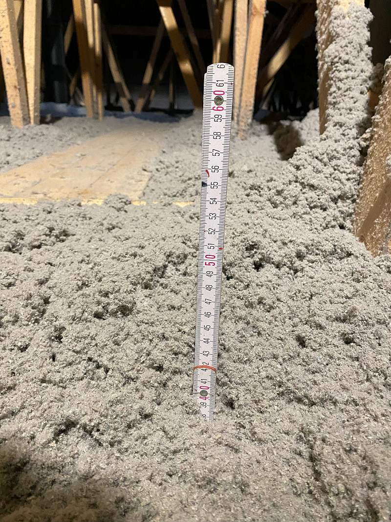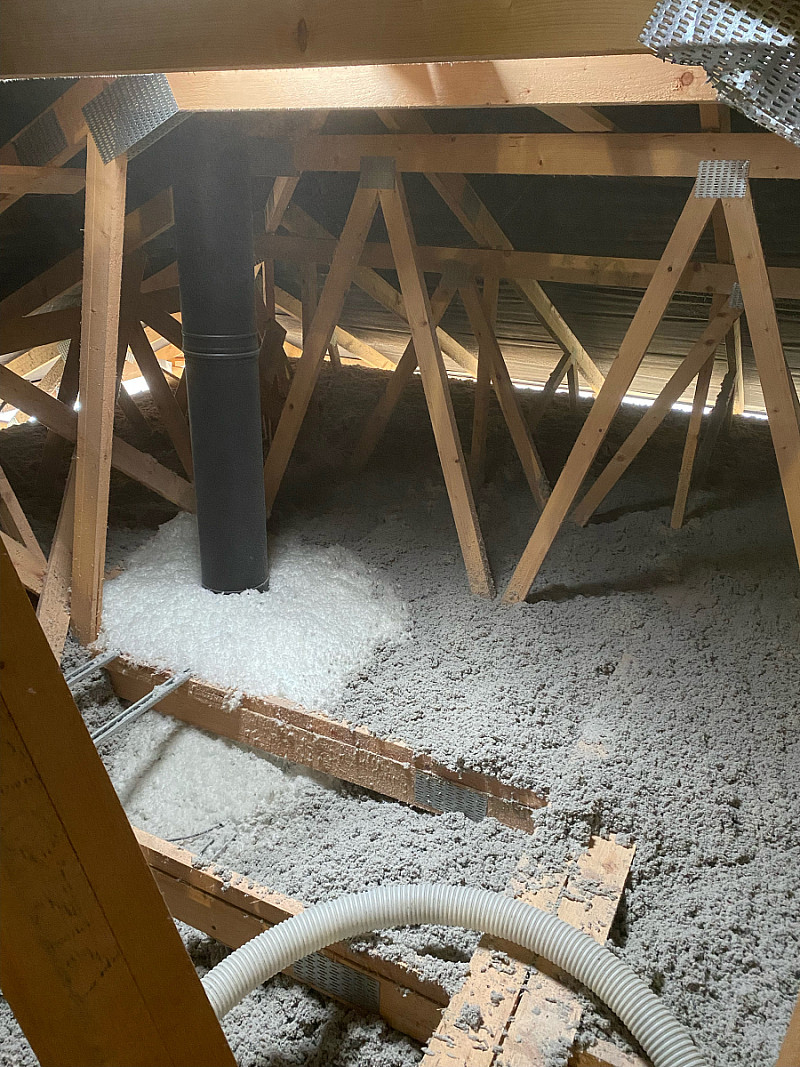 Materiál: celulóza ThermoFloc o tloušťce 35 cm v kombinaci s minerální izolací (kolem komínu) URSA Pure Floc.