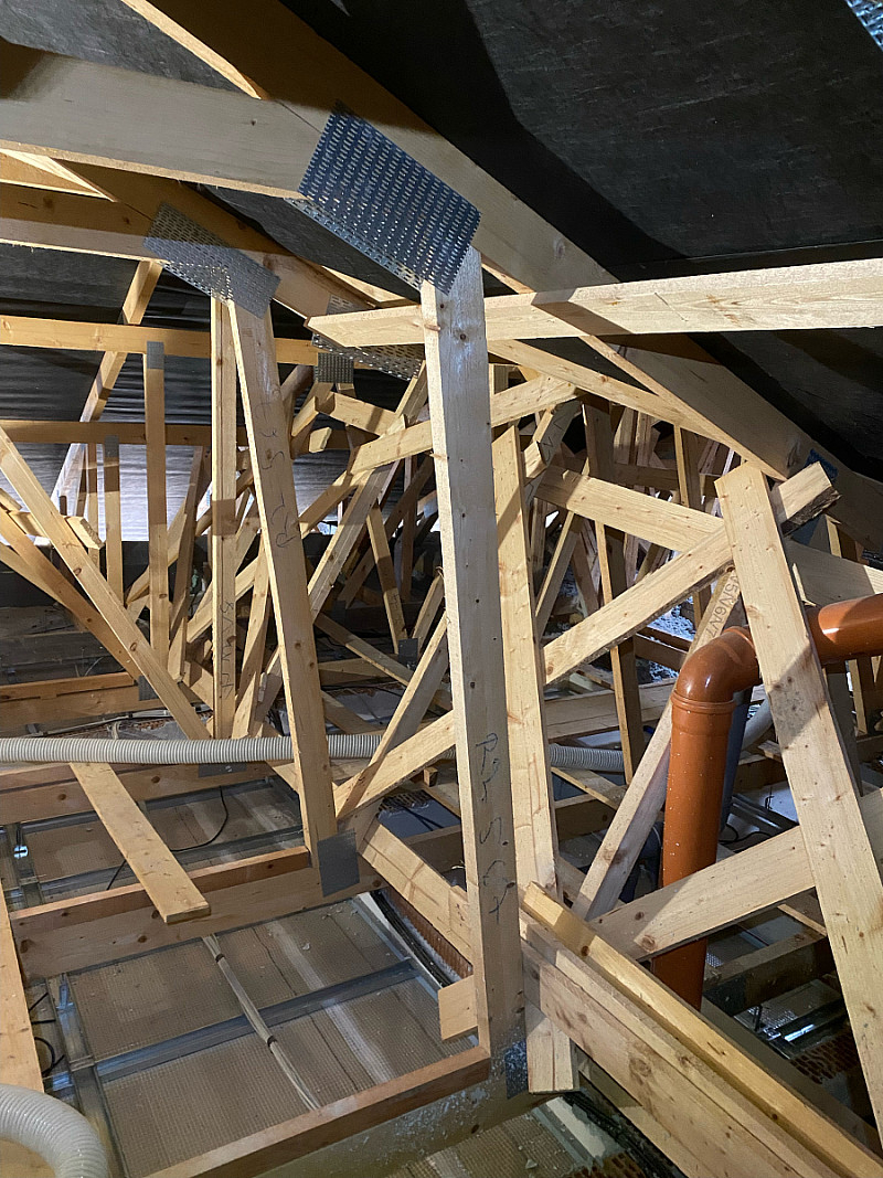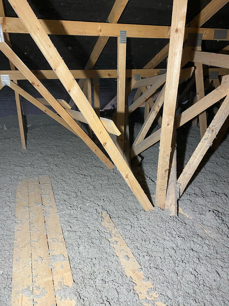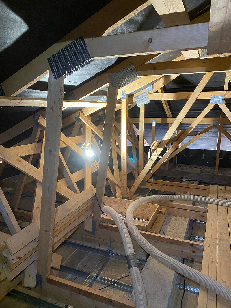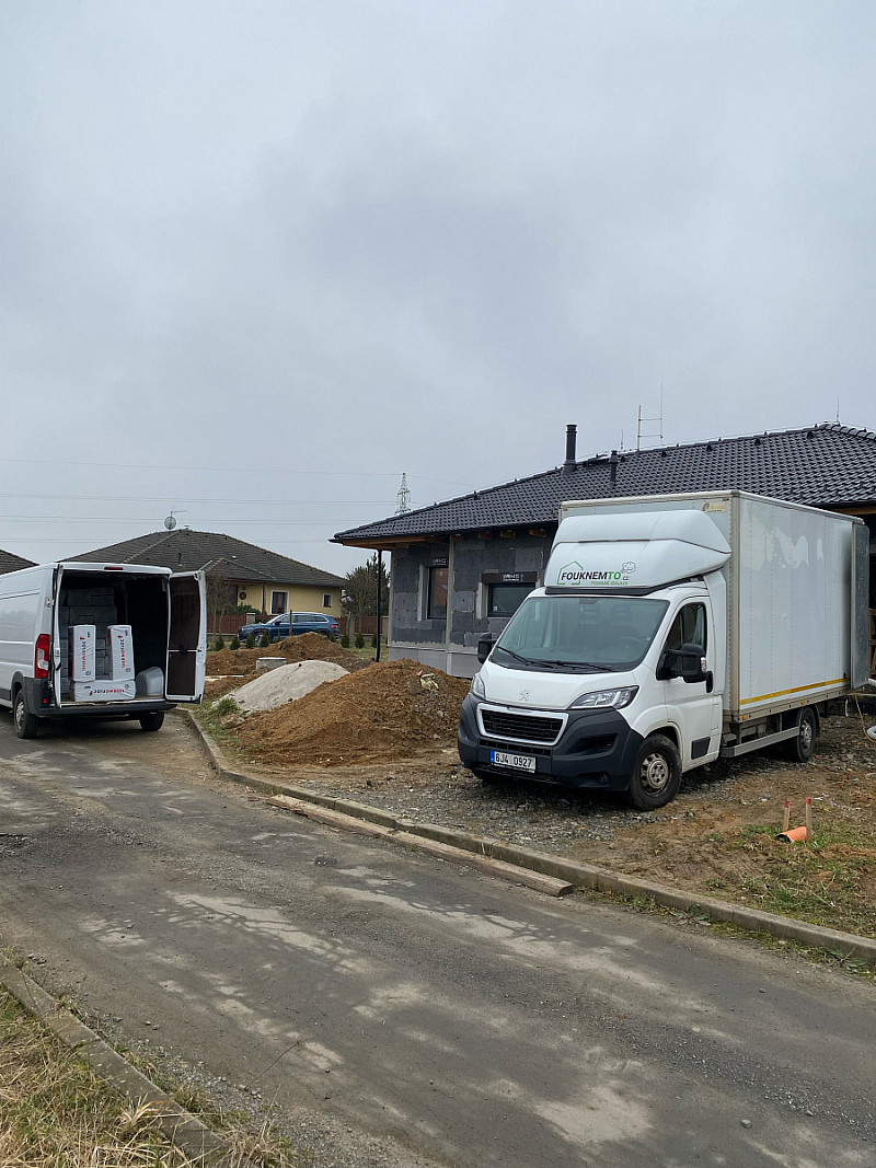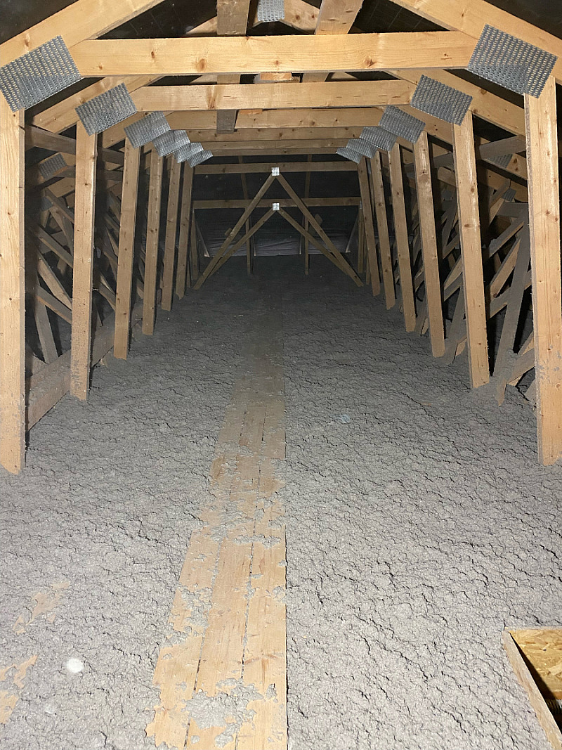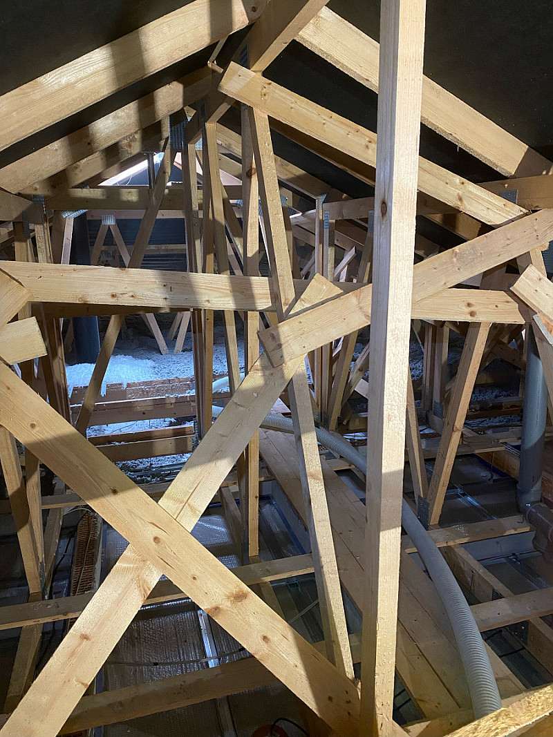 Materiál: celulóza ThermoFloc o tloušťce 35 cm v kombinaci s minerální izolací (kolem komínu) URSA Pure Floc.
