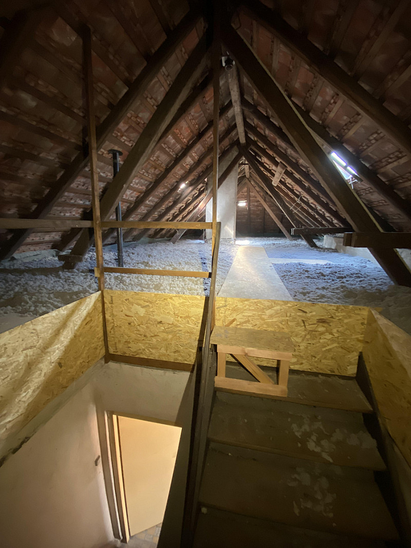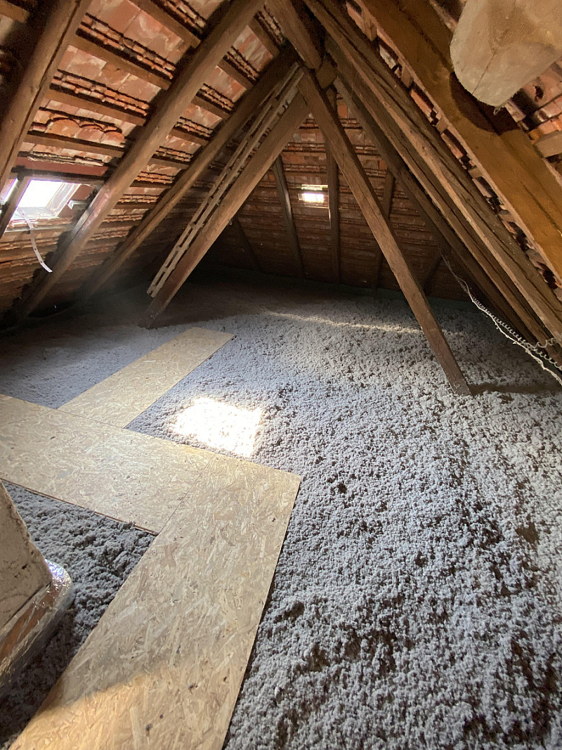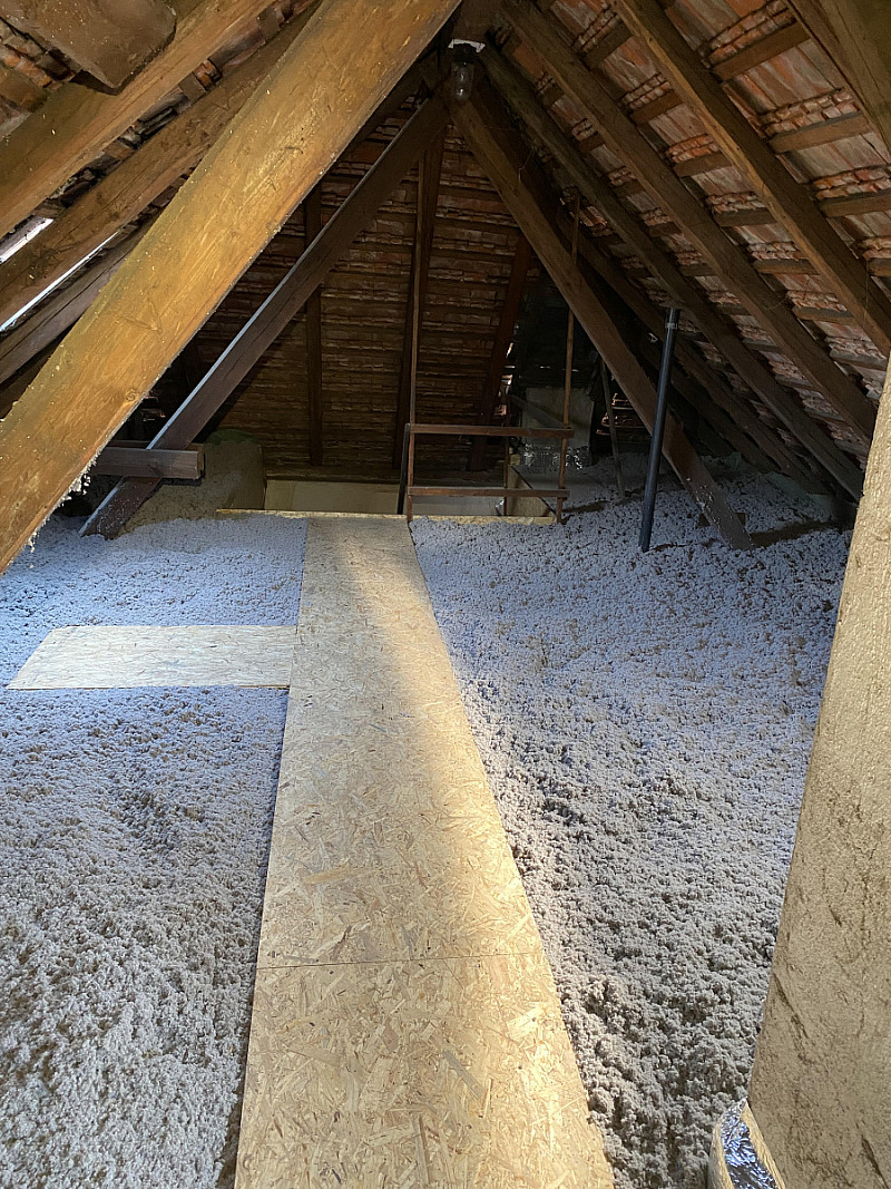 Tento dům měl kvůli absenci izolace stropů v zimním období problémy s plísněmi a vlhkostí, to vše díky tepelným mostům. Obrovský únik tepla byla jen třešnička na dortu. Nyní majitelé ušetří za plyn a ještě se zlepší komfort v podkroví. Při realizaci bylo zjištěno, že na 3 místech chybí střešní tašky, tak jsme je dodali, aby nikam nezatékalo. Vše bylo hotovo za 7 hodin vč. pochozí lávky.