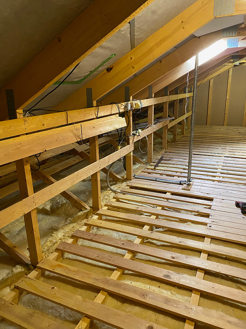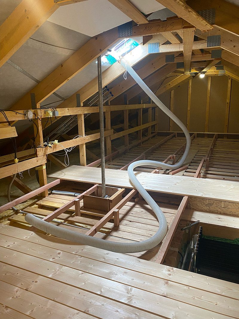Pan majitel původní podlahu rozebral a my tak mohli vytvořit vyvýšený rošt pro podlahu. Vznikla tak nádherná podlaha v celé ploše z hoblovaných sušených prken.