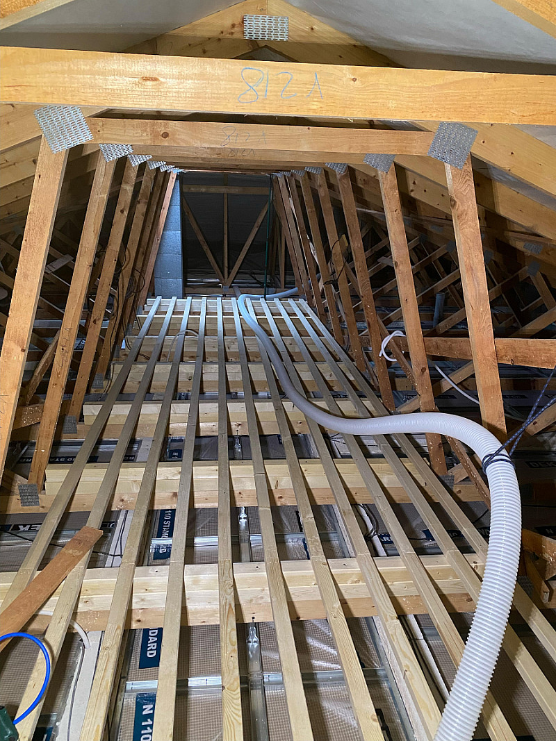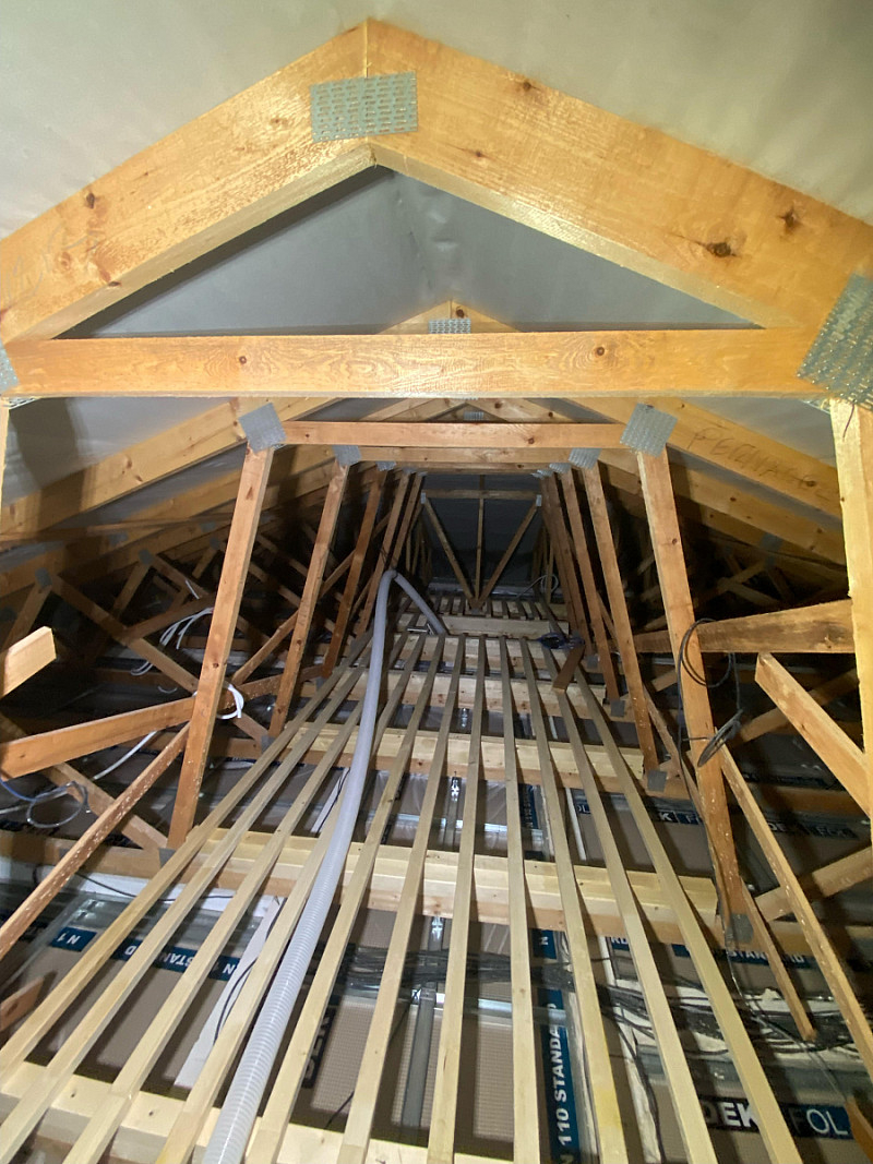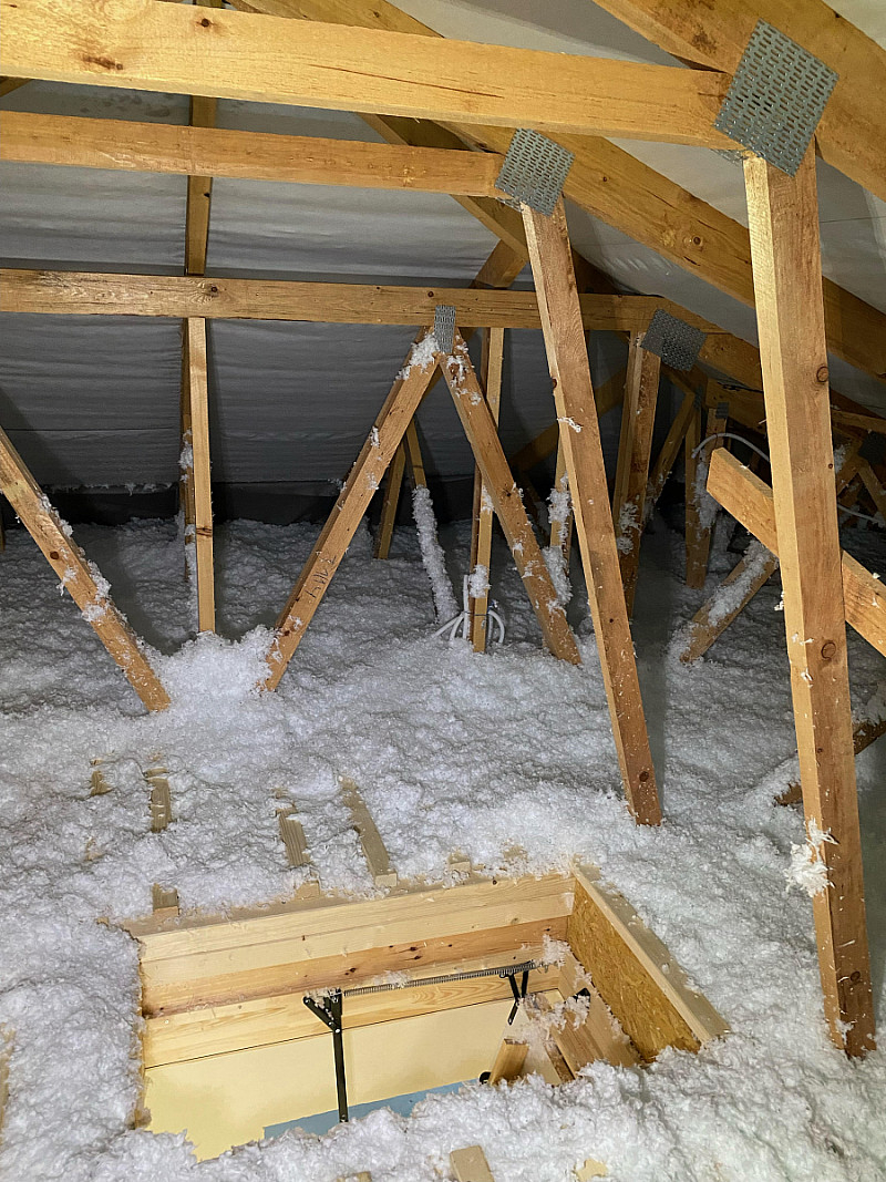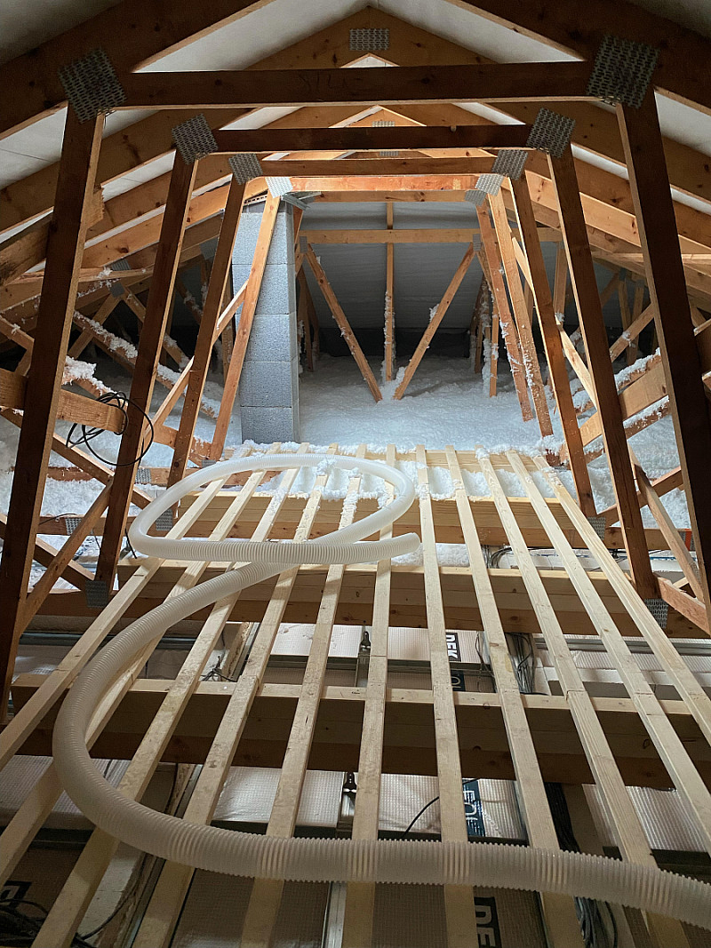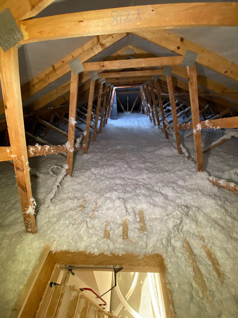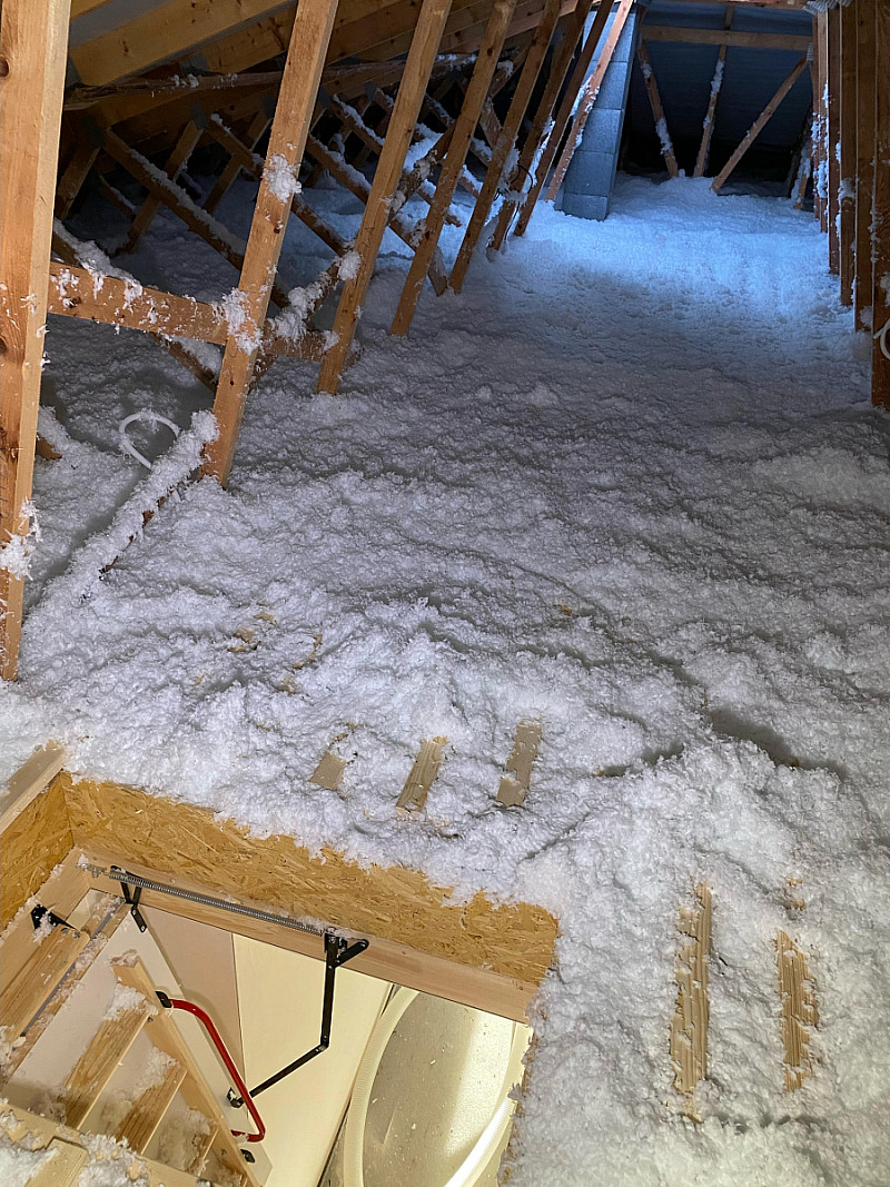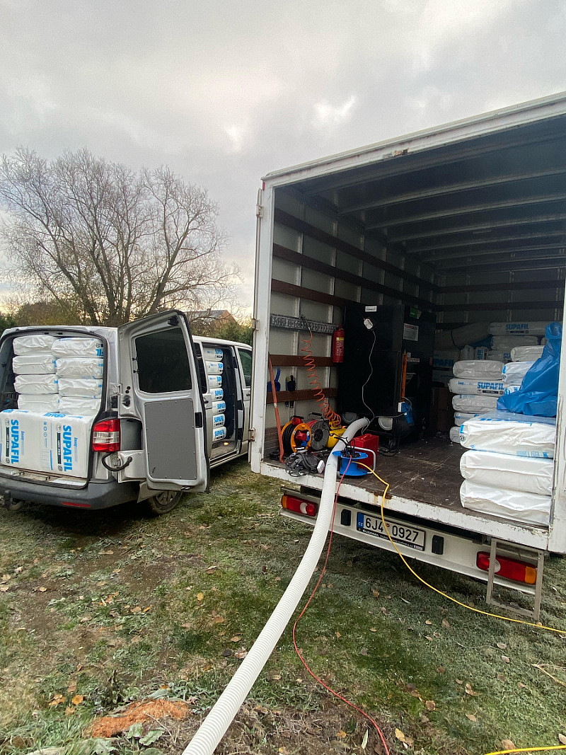 Aplikovaná tloušťka 45 cm Knauf Supafil Loft PRO, 68m3. Pan majitel měl již připravený rošt pro prkennou podlahu podlahu. Délka aplikace 6 hodin.