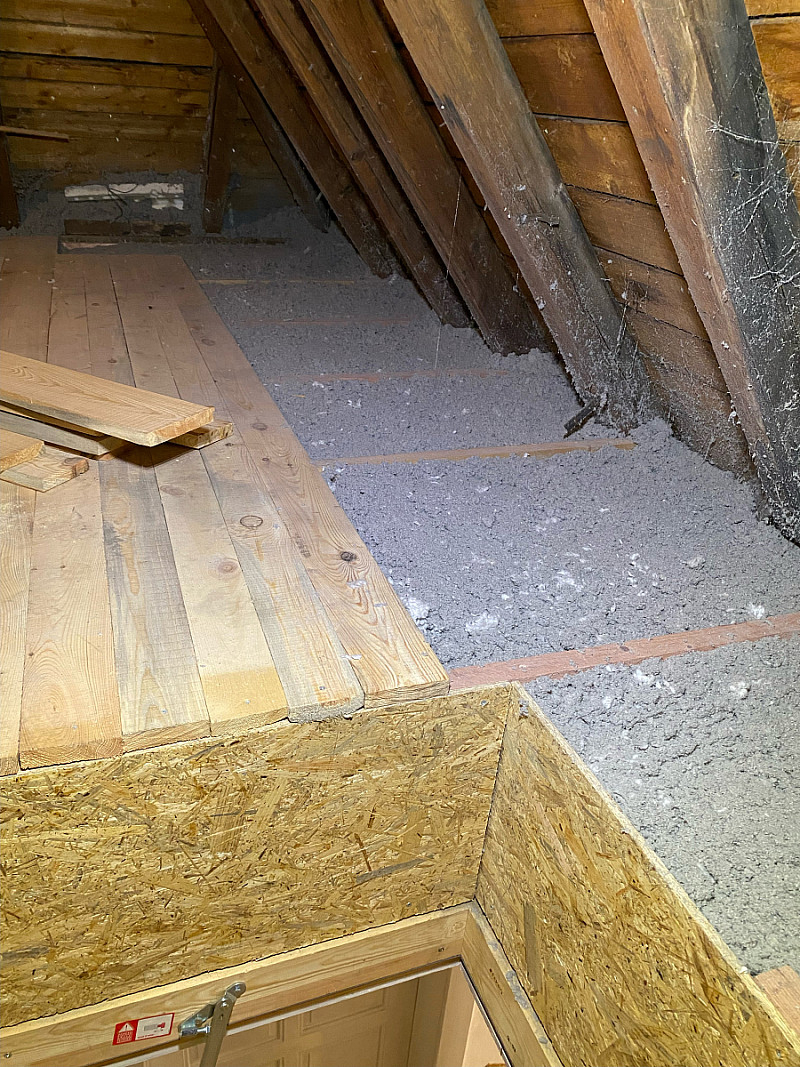 Materiál: Celulóza ThermoFloc o tl. 30 cm v kombinaci s minerální izolací URSA Pure Floc (kolem komína)