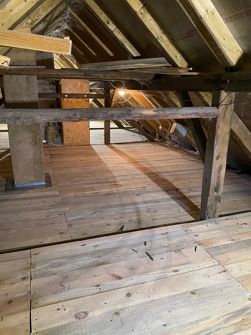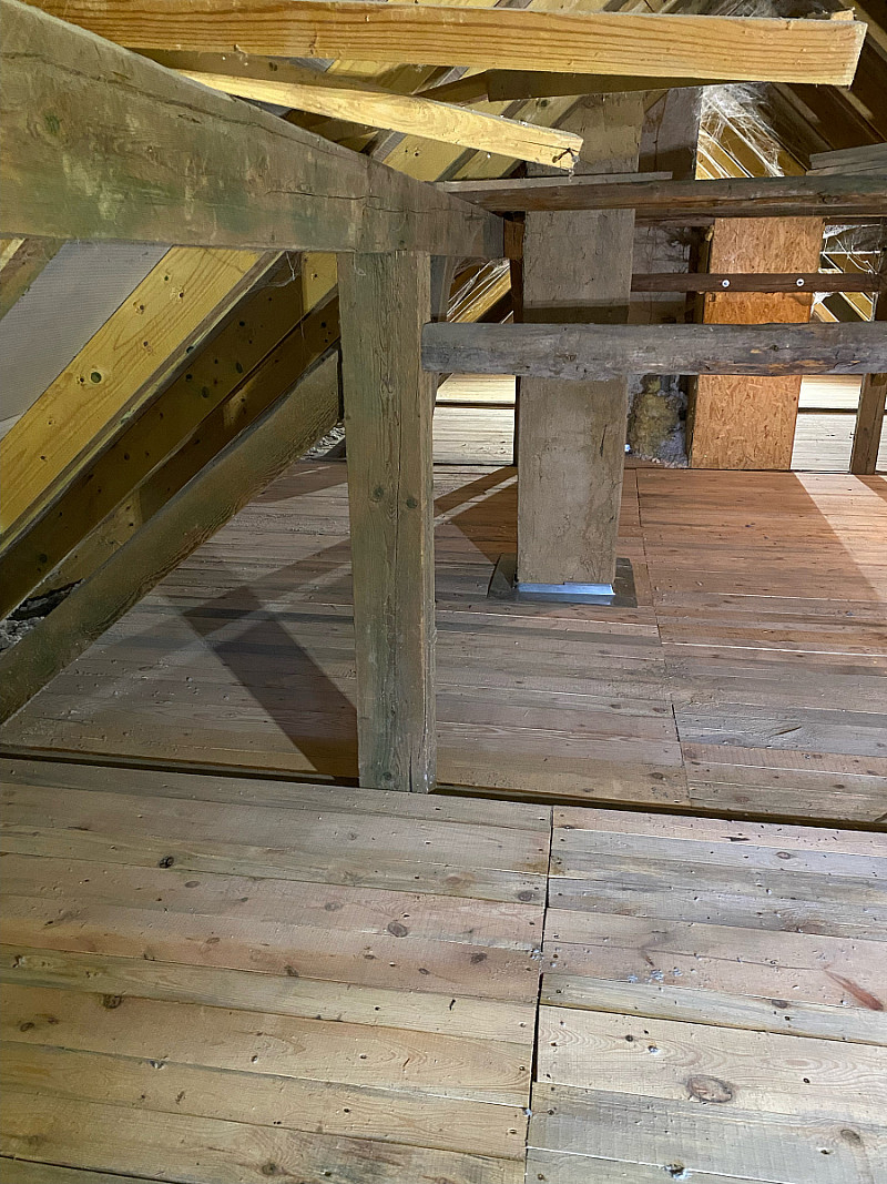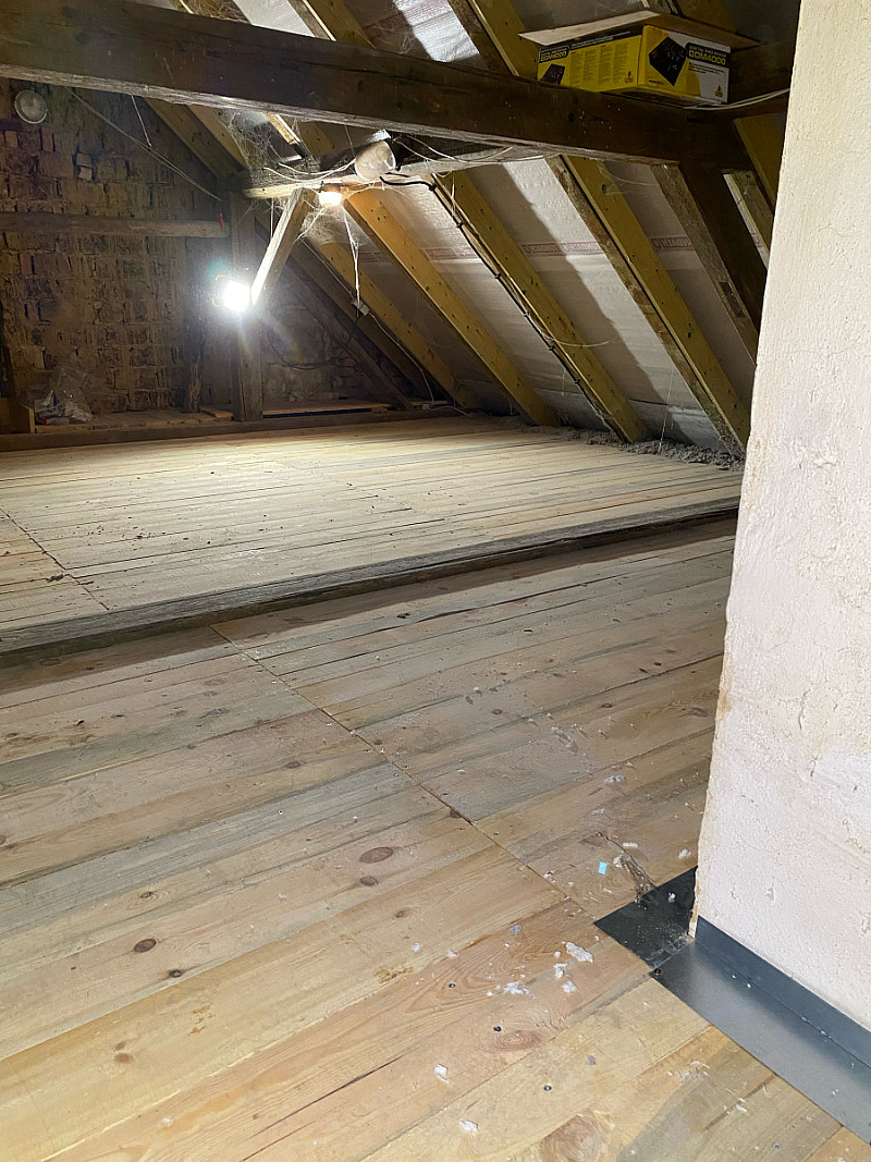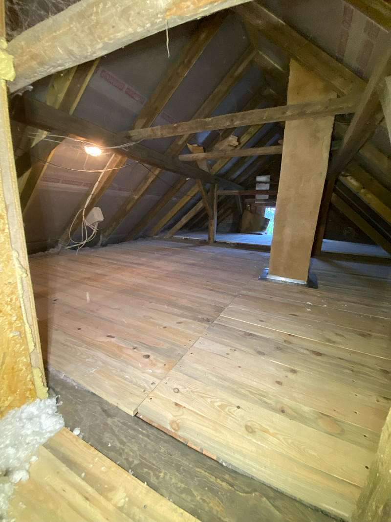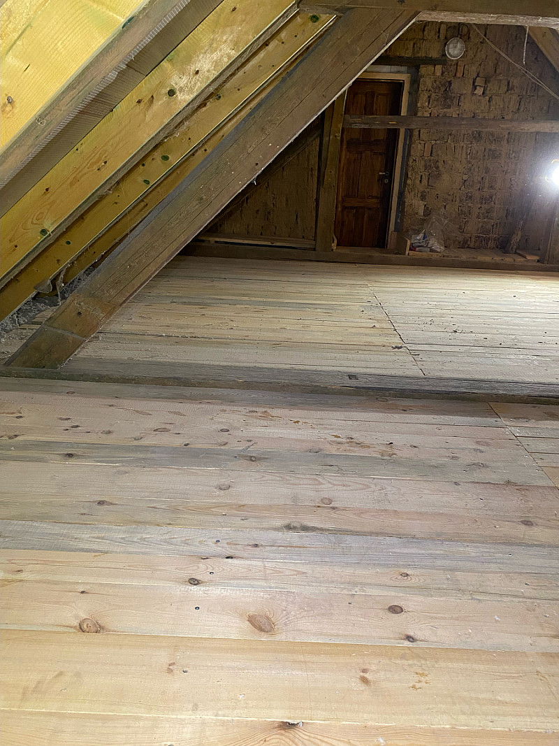 2. část domu byla komplikovanější. Zde nebyla izolace žádná a paní majitelka chtěla zachovat kompletní půdní prostor. Vytvořili jsme tedy vyvýšený rošt a následně zaklopili celou plochu prkny o tl. 25 mm (plocha 90m2). Samozřejmě se pod podlahou skrývá 40 cm celulózy ThermoFloc, která udrží teplo domova.
