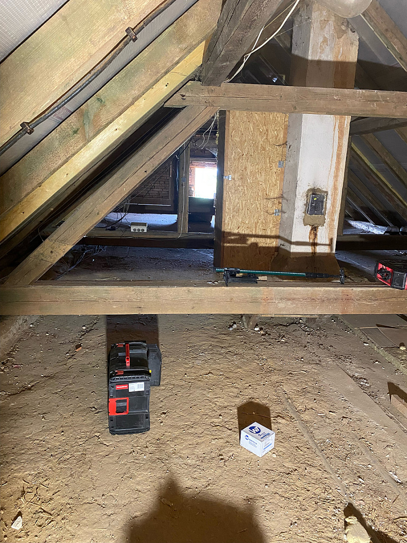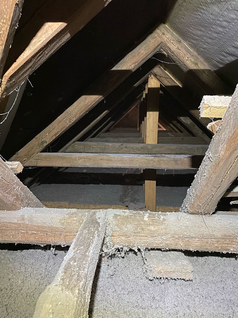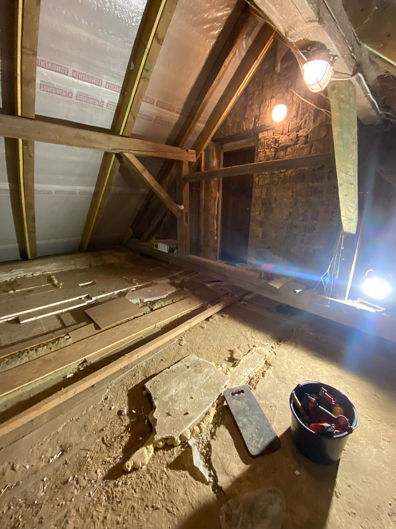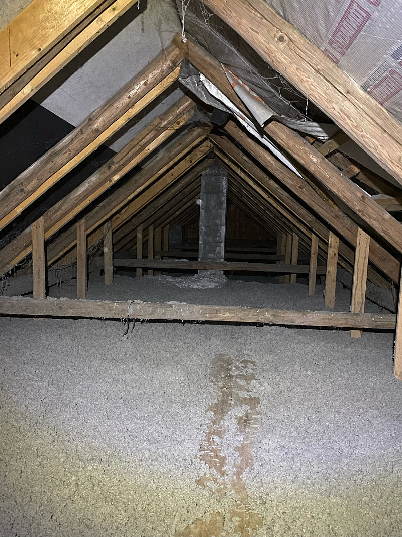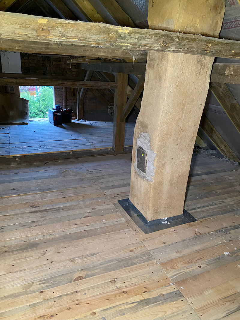 1. část domu měla malou vrstvu celulózy. Zvedli jsme pochozí lávku, vytvořili bednění, doplnili celulózu a opravili špatně provedenou izolaci kolem komínů.