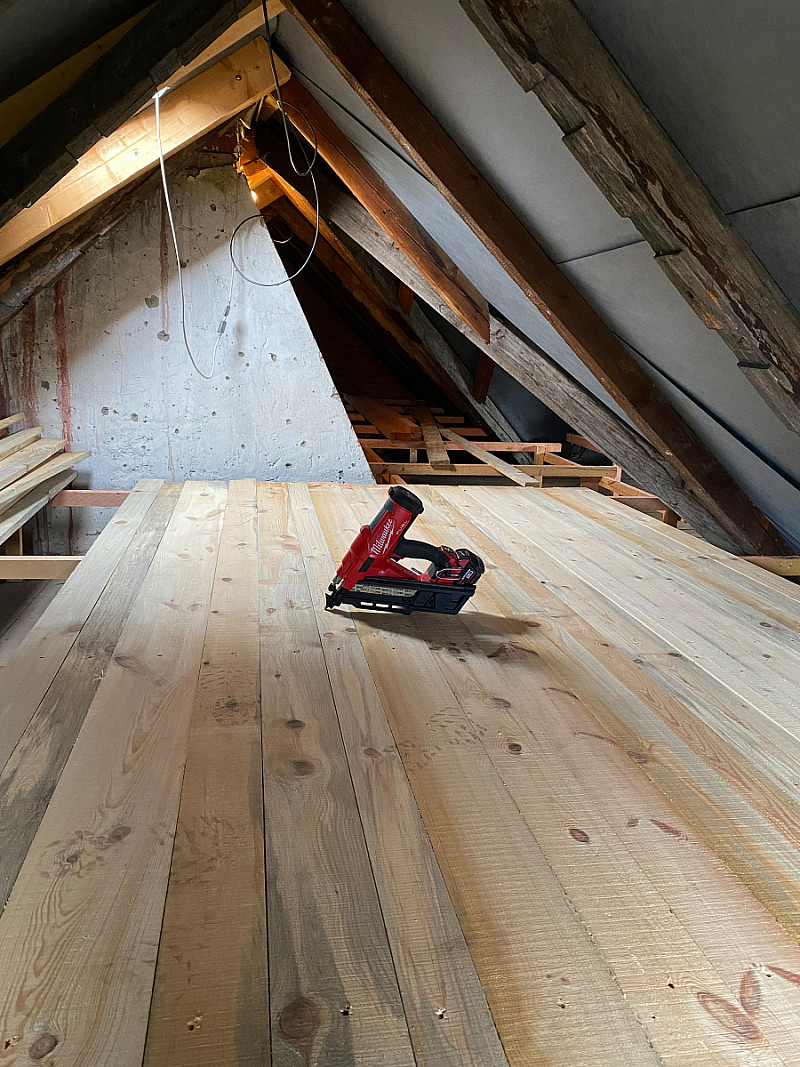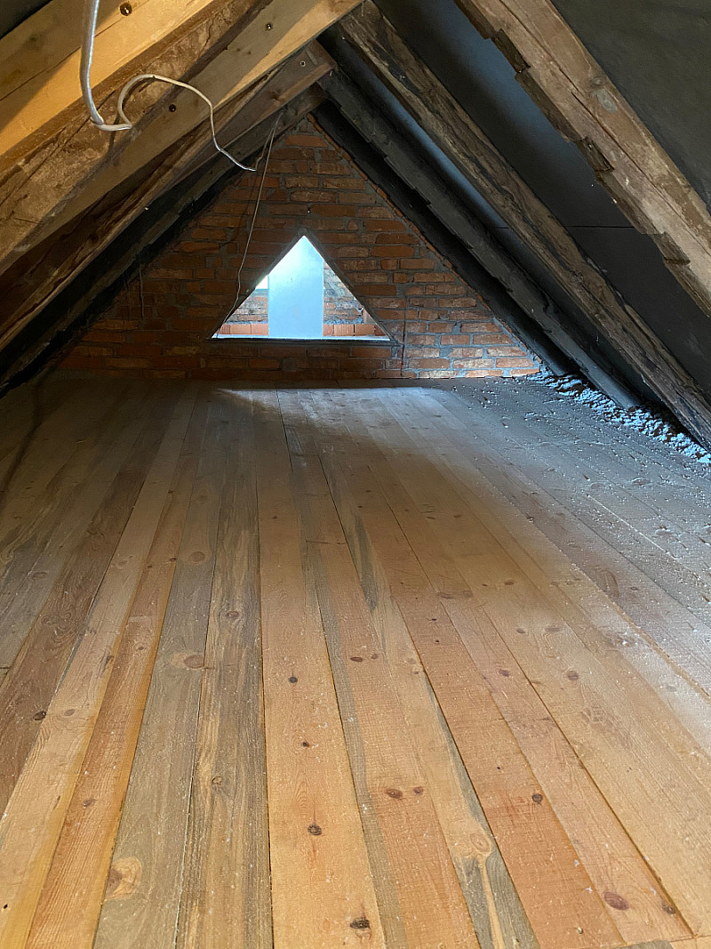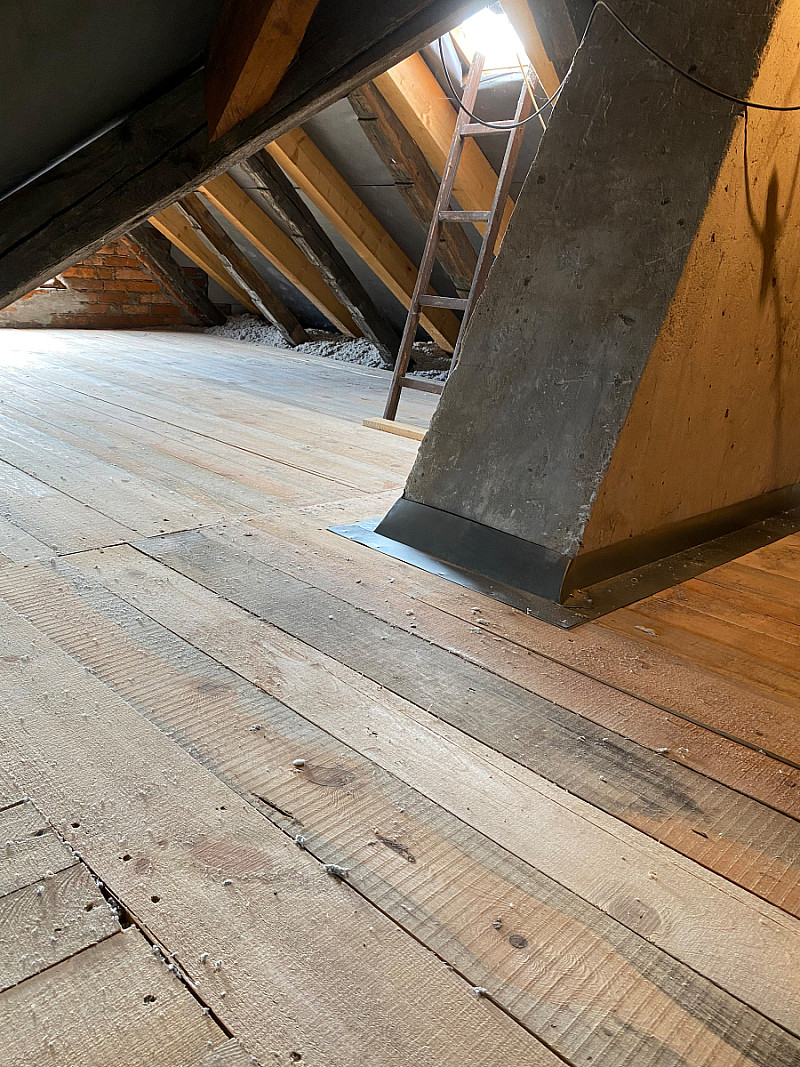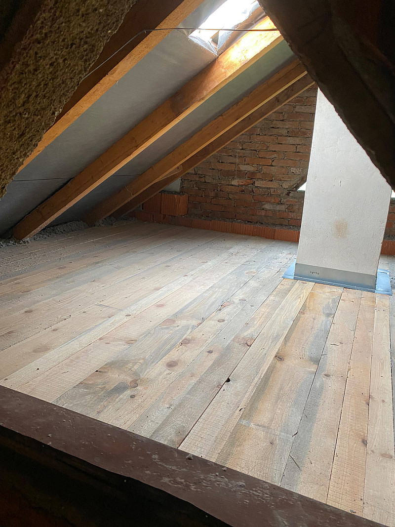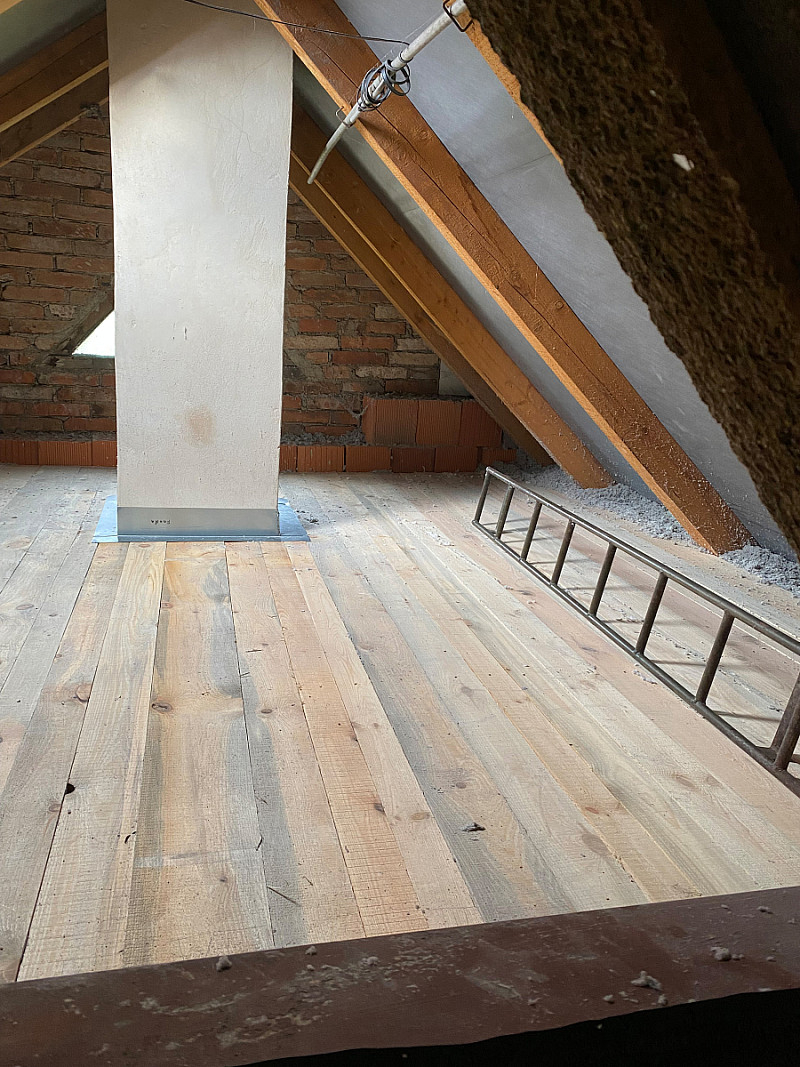 Tento rodinný dům měl na stropech pouhých 5 cm staré izolace, tudíž unikalo nemalé množství tepla. Majitelé chtěli i nadále využívat prostornou půdu, tudíž jsme vytvořili rošt a novou prkennou podlahu, abychom mohli aplikovat izolaci. Majitelé nás skvěle pohostili, práce šla od ruky a vše bylo hotovo za 12 hodin.
