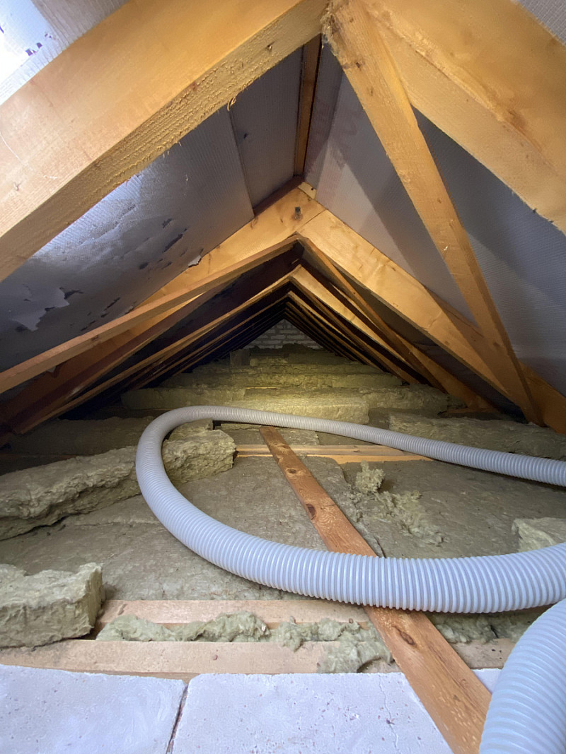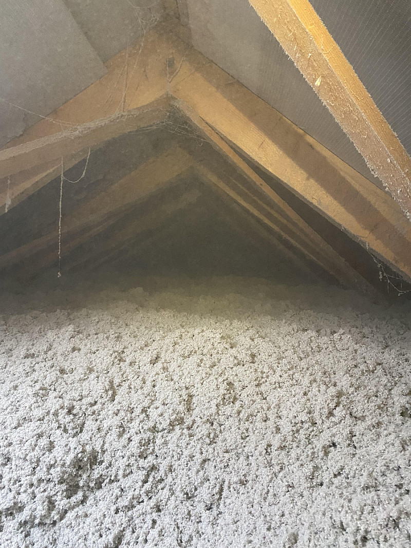 Stará izolace měla nespočet míst, kde bylo vidět až na sádrokarton, tudíž utíkalo nemalé množství tepla. Celá realizace byla financována dotací NZÚ light. Materiál: celulóza ThermoFloc o tl. 30-35 cm