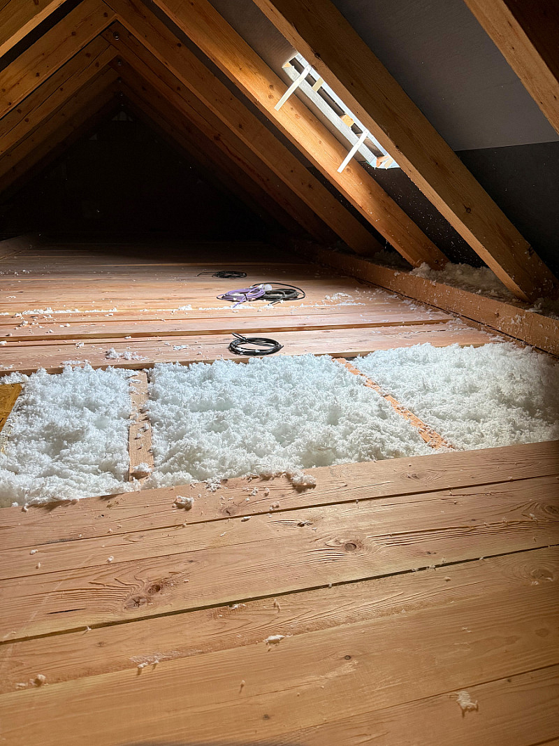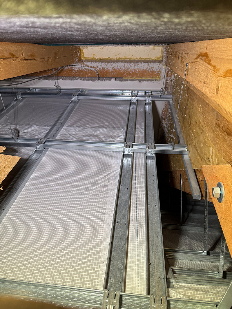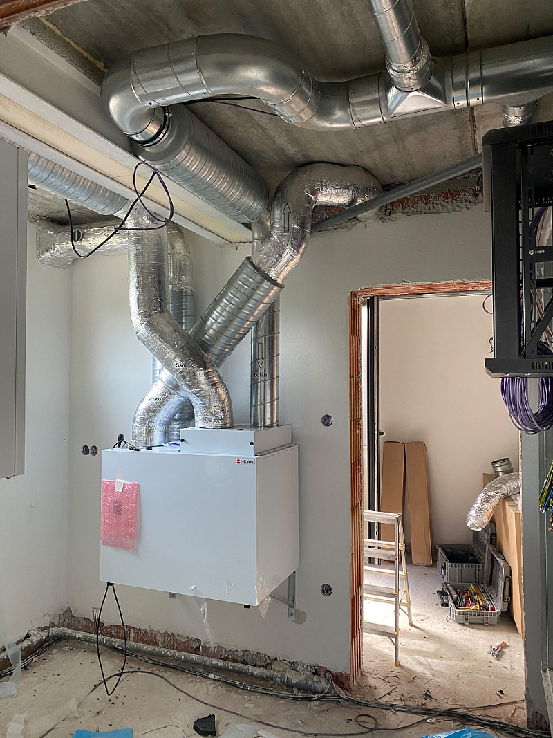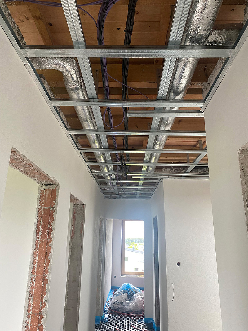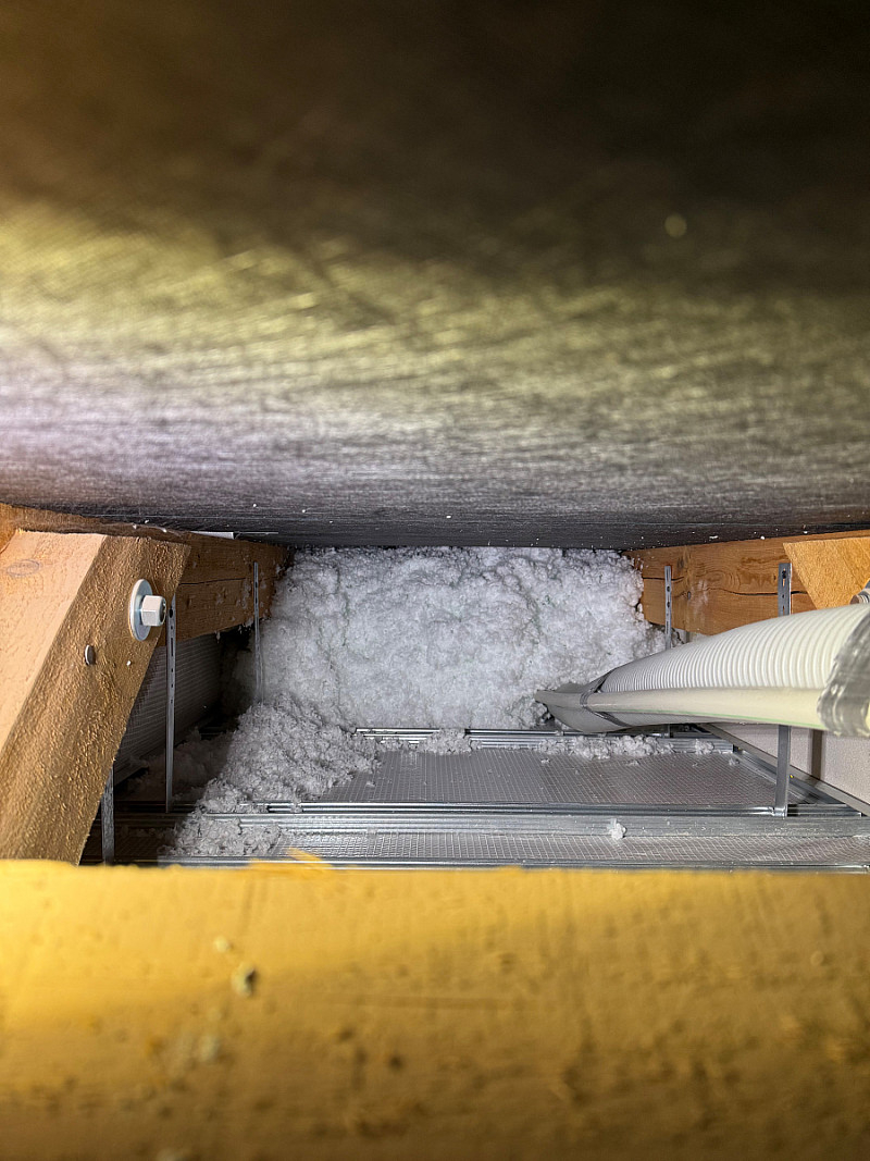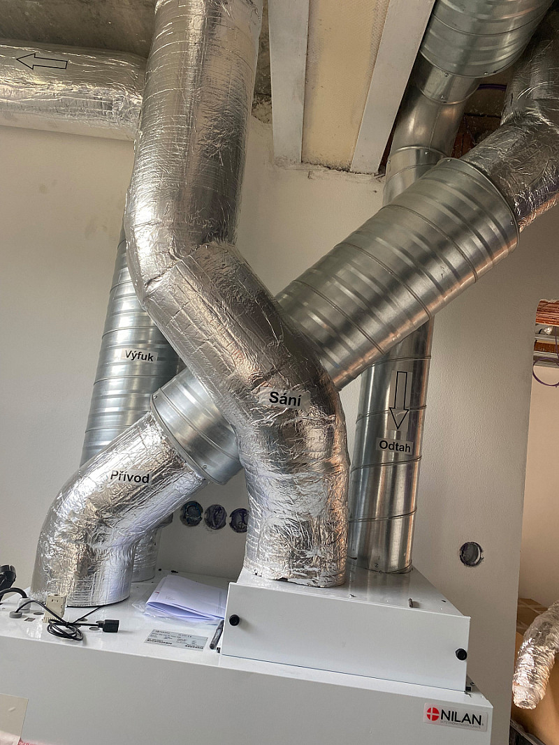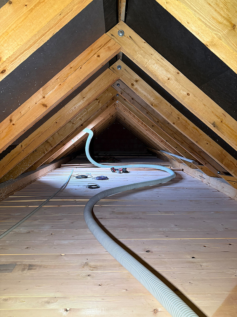 Zde jsme prováděli kompletní montáž vzduchotechniky (VZT se zabýváme 10 roků) a zateplení půdního prostoru. Nejdříve byli provedeny rozvody vzduchotechniky a po dokončení SDK podhledů následovalo zateplení.