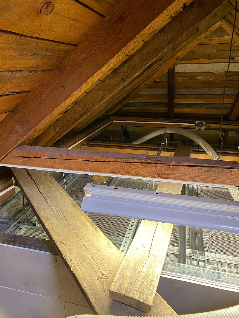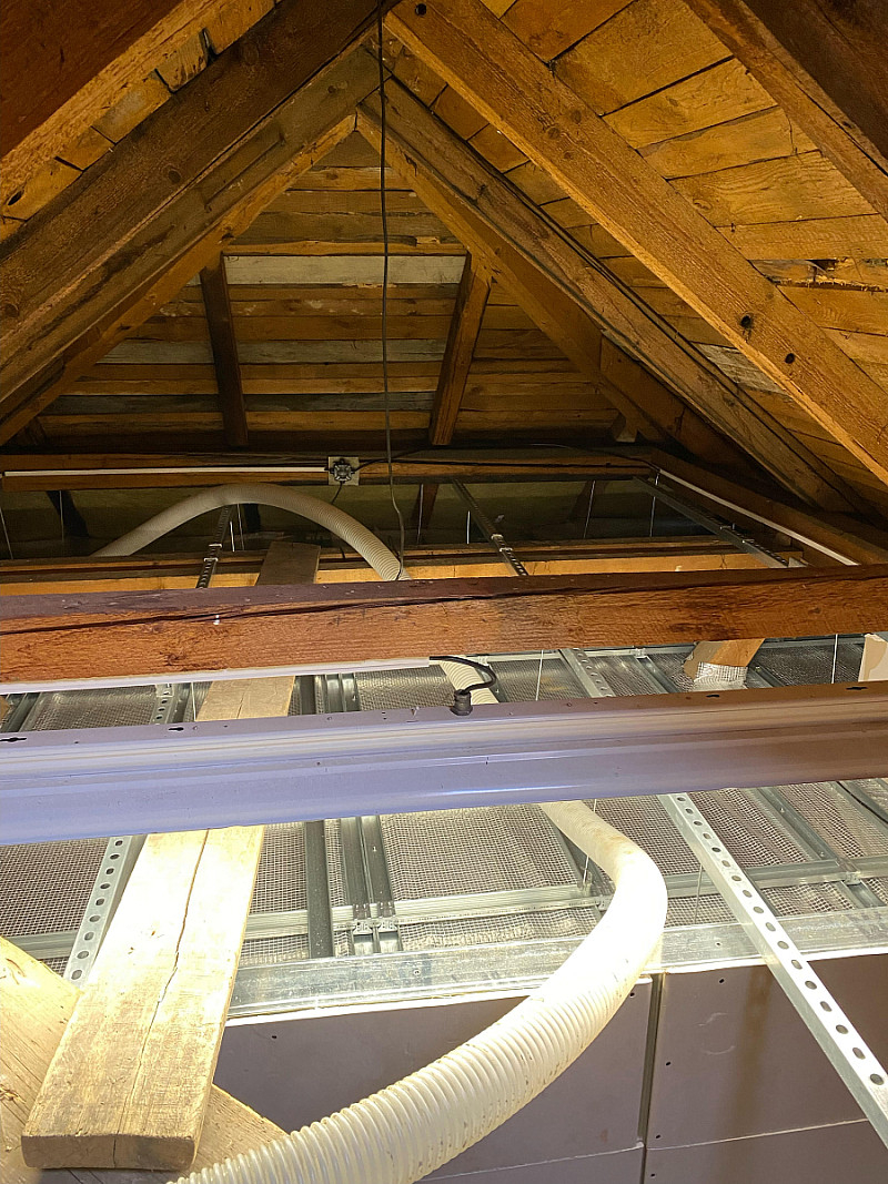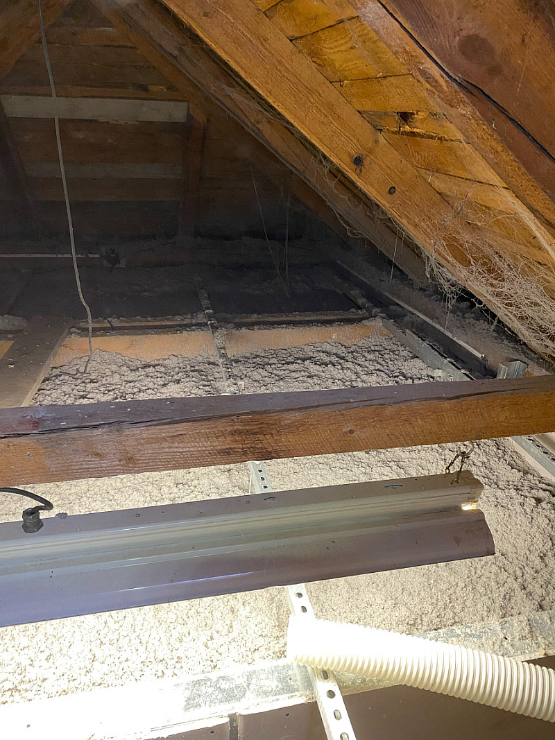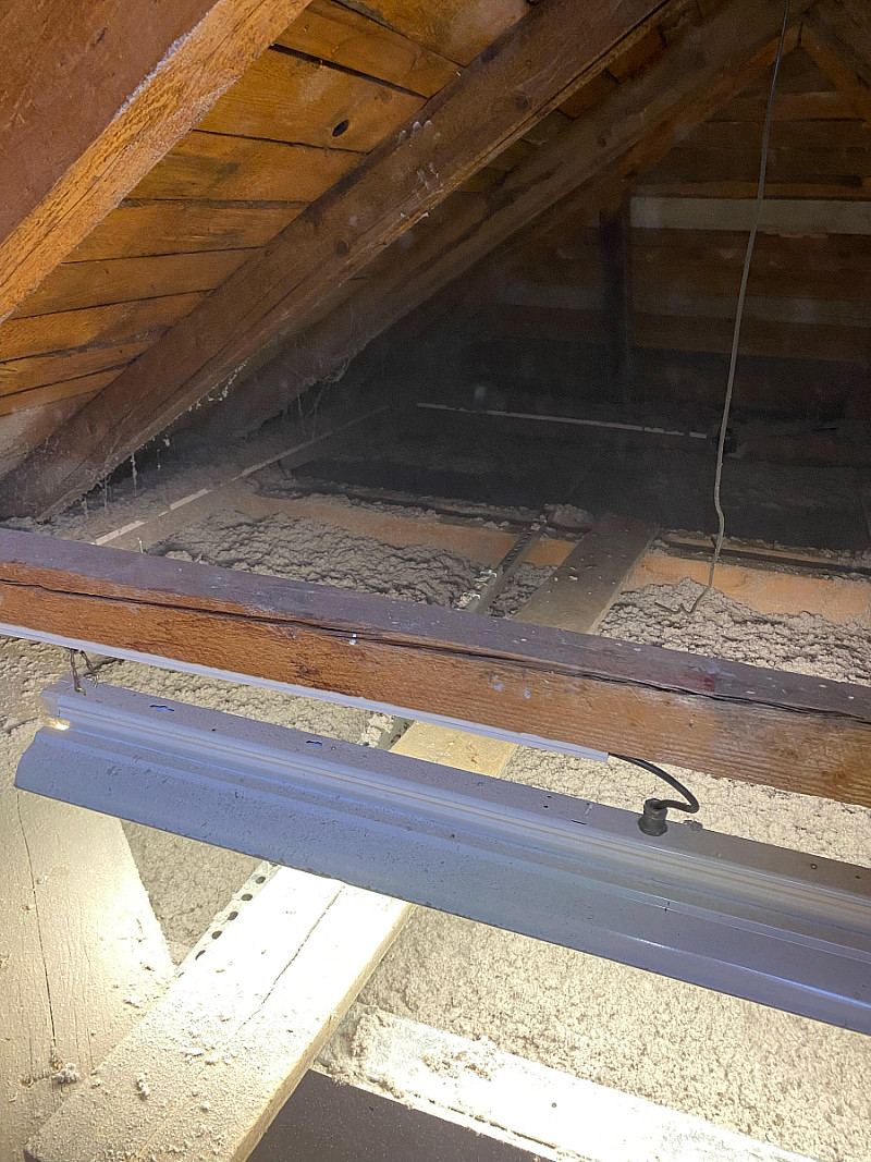 Izolace stropu nově vybudovaného podkroví. Materiál: celulóza ThermoFloc o tloušťce 45 cm.